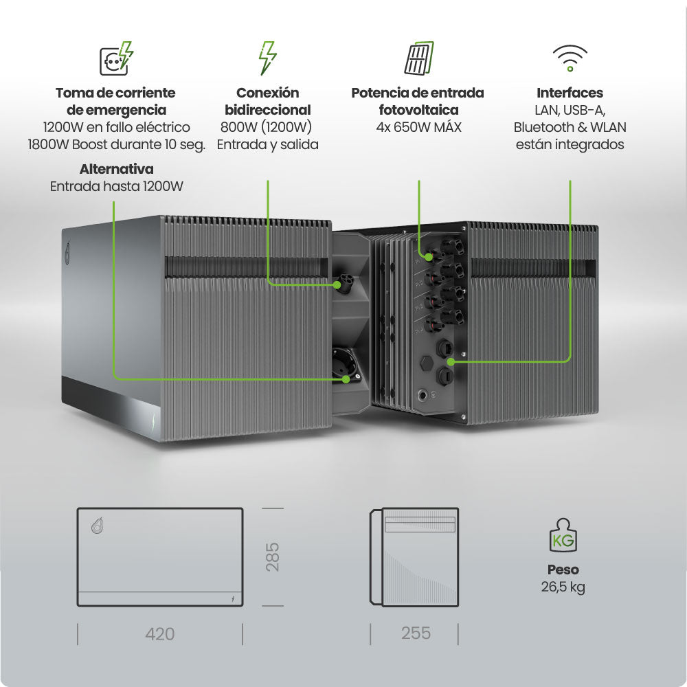 La potencia máxima de carga solar de una unidad es de 2600 W, más 1200 W adicionales a través de la toma de emergencia, lo que suma hasta 3800 W en total.